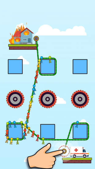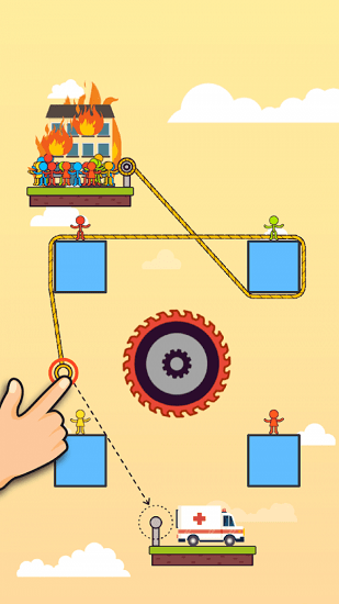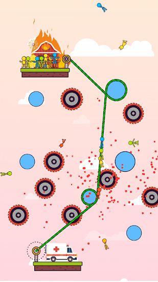 火柴人绳之谜题是解密类型的手机游戏,你在游戏中需要利用绳子将中间的齿轮串起来,要注意的是,不要经过由刀片的齿轮,不然等下你火柴人就会被刀片给切死,游戏中由非常多的关卡,越到后面越难,需要你开动你的脑筋来想办法完成,快来试试看你能闯多少关吧!