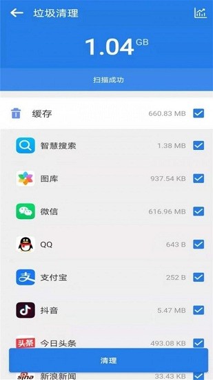 1、无论是社交软件造成的废弃物或是各种各样运作缓存文件,都能够在服务平台里边快速检测而且清理;