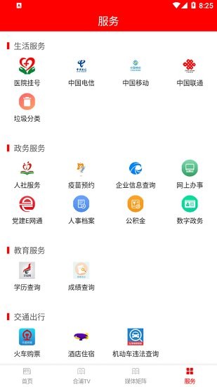 人社服务、疫苗预约、企业信息查询、网上办事、党建E网通、公积金、人事档案、数字政务