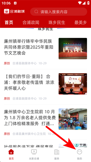 1、打开合浦融媒APP,点击底部导航栏的我的,进入个人页面。