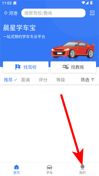 1、在晨星学车宝首页,点击右下角我的选项,进入个人中心界面。