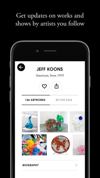 从莫奈到沃霍尔再到玛丽娜·阿布拉莫维奇 Artsy 收录了古今艺术大师的艺术作品,包括杰夫·昆斯、埃德·拉斯查以及辛蒂·雪曼等艺术家。Artsy 让您身临其境般地欣赏在古根海姆博物馆、旧金山现代美术馆、大英博物馆、高古轩画廊、佩斯画廊、白立方画廊、维多利亚·米罗画廊以及来自 50 个国家的其他 600 多处艺术展馆墙壁上陈列的艺术作品,第一次将所有艺术作品汇聚一堂,而这完全免费。通过强大的缩放功能,您用肉眼即可轻松地欣赏作品的一笔一划。