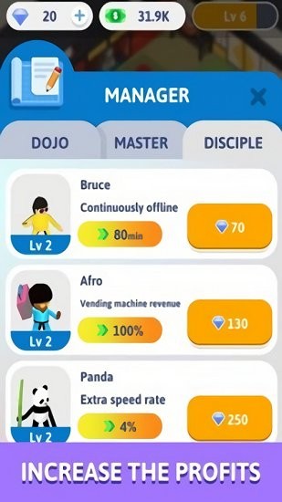2、解锁更多高级的武术大师来指导教学,提升人气值吸引更多人;