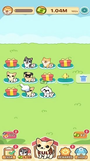 1、点击屏幕,将相同的两只小狗崽合并,就有可能解锁高级稀有品种;
