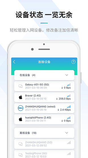 4.设备管理:查看已连接上网络的设备流量使用状态及所属主流设备品牌,对连接设备进行备注,设备状态,一览无余。