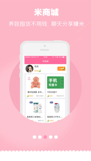 2.赚米:持家有道,聊天赚“米”,琳琅满目的玩具、奶粉、尿布、胎教仪等等,让你赚到盆满钵满!