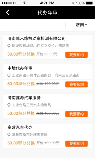 5、【代办年审】-根据定位城市显示代办年审单位,方便车主,以及可用平安积分兑换服务。