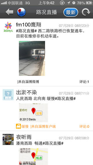 路况分享是“淄博交广”客户端最具特色的功能之一,路况来源分为两类,一是官方路况,由淄博交通文艺广播采集汇总权威部门路况信息形成;二是网友时时路况,所有安装“淄博交广”客户端的交通参与者均可时时上报路况与他人分享,形成涵盖淄博全市各个区域的动态路况地图,达到人人报路况,人人收路况的效果。“淄博交广”客户端报路况具备自动锁定用户所在地点和行车方向、自动启动照相机的功能,由用户快捷选择,同时还提供了文字、语音、图片方式进行补充说明。