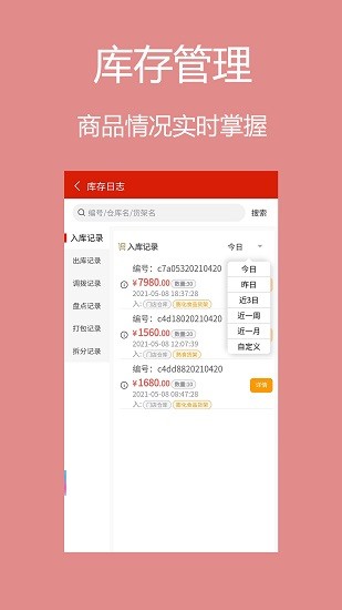 入库、出库、调拨、盘点、打包、拆分等库存日志管理,轻松查询每件商品去处,清楚库存数量,及时补货。