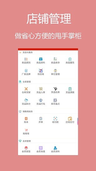 针对货品与服务、仓库、销售和财务、会员管理等,帮助您更好的管理如商品、出入库、账本、供应商、会员等重要事项,您只需要做省心的甩手掌柜!
