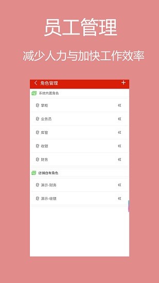 可自行添加角色,业务员、库管、收银、财务等员工管理,有效减少人力、提高工作效率;
