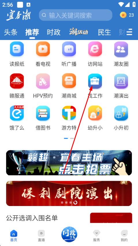 1、打开宜春潮App,在首页找到并点击找工作图标。