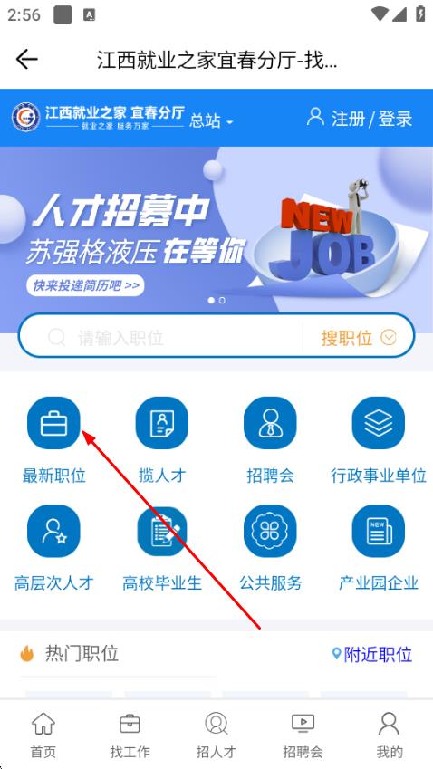 2、进入江西就业之家宜春分厅-找工作页面后,点击最新职位选项。
