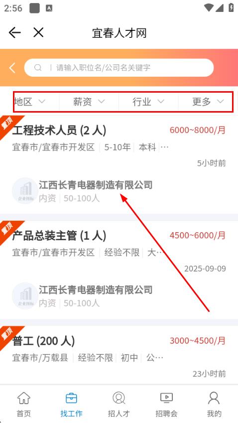 3、在职位列表页面,可以根据地区、薪资、行业等条件进行筛选,点击感兴趣的职位。