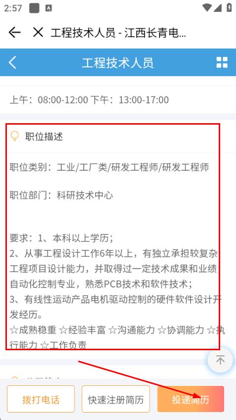 4、进入职位详情页面,查看职位描述、要求等信息,可点击投递简历按钮。