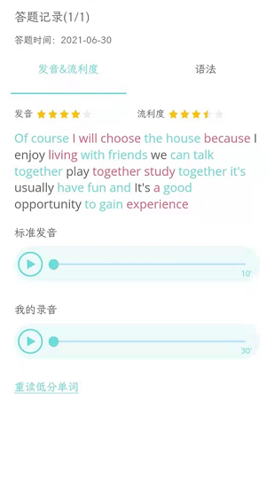 2、发音&流利度测评:逐词展示测评结果,问题一目了然;