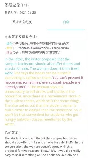 3、内容测评(托福综合口语):检测答案缺失的关键点,帮助您完善答案;