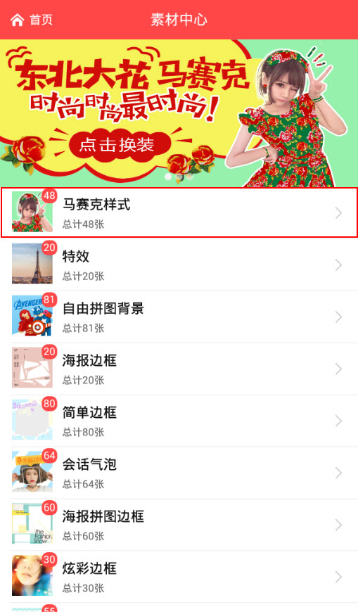 2.点击素材中心,这里首页就有最近热门的东北大花袄的素材,然后选择马赛克样式。