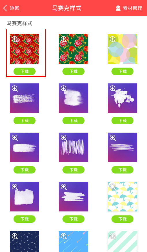 3.选择一种大花袄的马赛克样式下载,下载完毕后我们就可以在对图片美化的过程中用使用大花袄这个马赛克样式了。