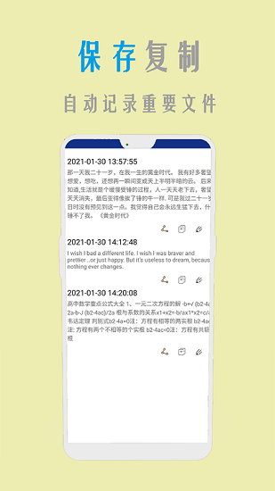 只要复制过的内容,我们都会自动为您保存在复制历史功能里,这样就算太急忘记保存也没关系,打开历史,重要文件都保存在里面了;