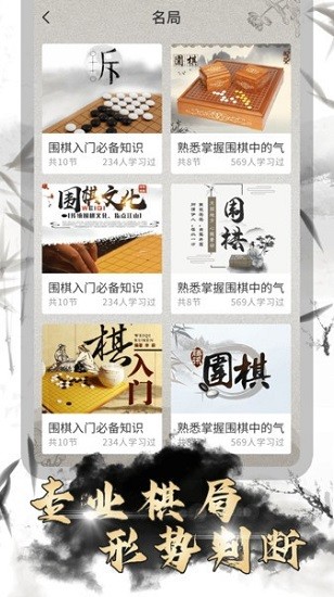 围棋双人对战这是一个可以学习围棋的平台,这里有海量的教学视频,让用户可以边看边学,并且还能与其他人对战哦,这里可以选择自己想学的棋法,这里的教学内容很多,让你慢慢的学会围棋,并且能够战胜敌人。