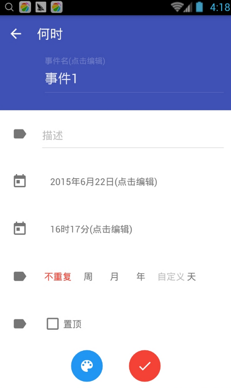 该应用采用质感设计,日期有农历比较符合咱们的使用习惯,有三个简洁的桌面小部件可选。你是否担心错过自己的生日?是否想知道距离下次发工资还剩多少天?是否想知道还有多少天放假?是否想知道距离每个值得纪念的日子的天数?何时便是这样一款小应用,帮助你记录生活中每一个值得纪录的日子。