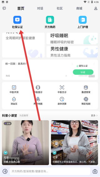 1、在应用首页面中,通过点击社保认证按钮,进入社保页面。