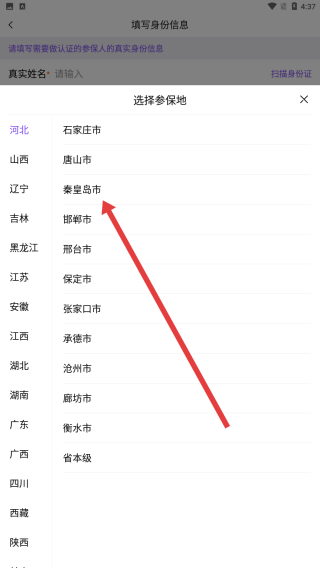 3、通过选择点击秦皇岛市为参保地,选择完后继续下一步骤。