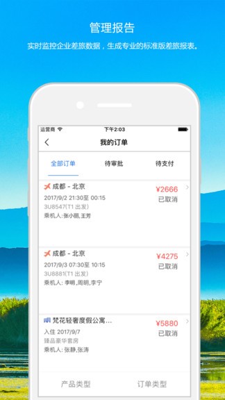 差旅管理,基于全部订单数据而自动生成了企业差旅数据报告;