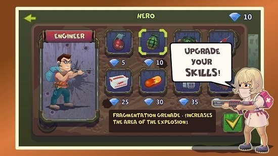 尝试穿越僵尸的所有浪潮,您将获得丰厚的钻石奖励。使用钻石,您可以升级英雄,购买新英雄或开设新位置。请记住,每个英雄都有自己独特的技能和能力。