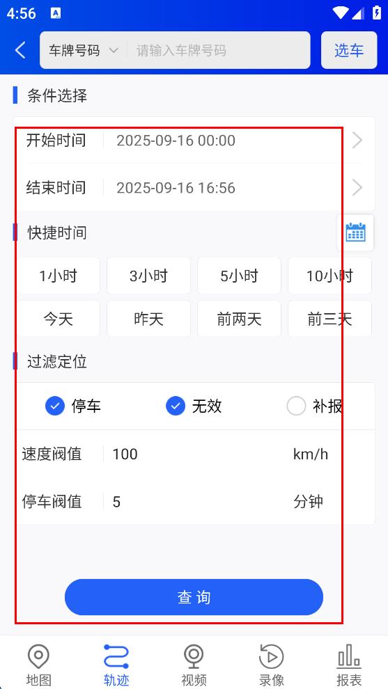 4、在轨迹查询页面,设置开始时间、结束时间等查询条件,也可选择快捷时间,设置过滤定位等参数后,点击“查询”,即可获取车辆轨迹信息。