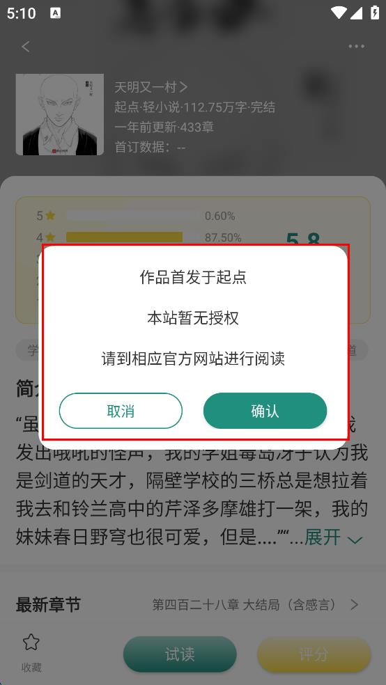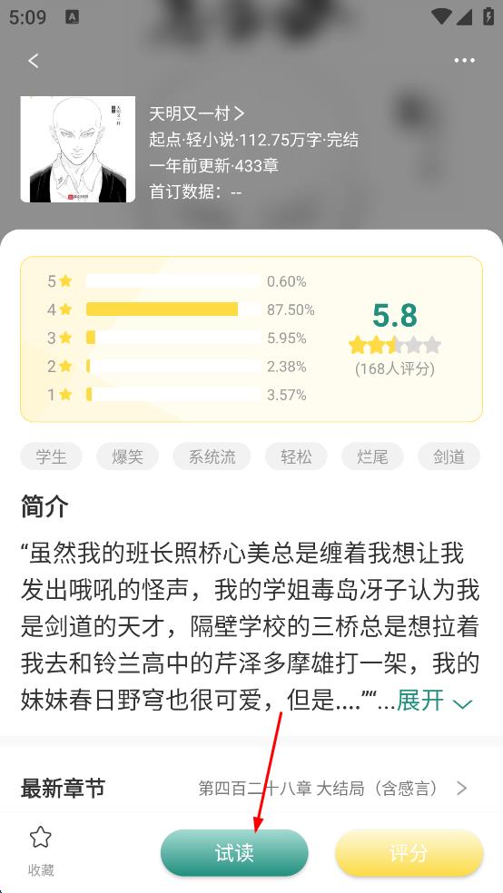 3、在小说详情页面,查看小说的基本信息,包括评分、简介等内容,然后点击页面下方的“试读”按钮。
