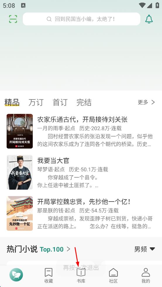 1、打开小说阅读软件,进入首页后,点击页面下方的“书库”选项,进入书库页面。