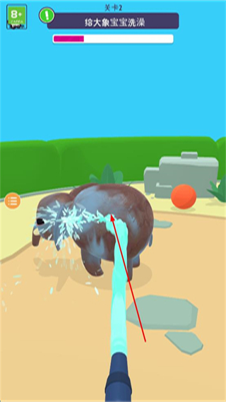 3、进入给大象宝宝洗澡关卡,操控水管对准大象身体,持续喷射水流清洁污渍。