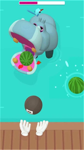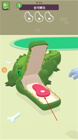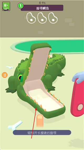 1、进入投喂鳄鱼关卡,轻触并长按对应区域,将食物投放到鳄鱼张开的嘴中。