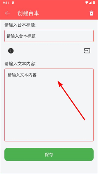 3、在创建台本界面,输入台本标题和文本内容后,点击保存按钮,即可完成台词创建。