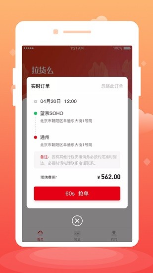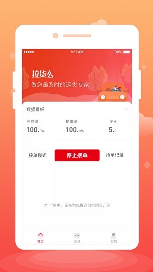 拉货么司机端为司机智能匹配订单,海量订单随时随意领取,浏览预约用车的订单,根据运输路线即可接单,同时滑动屏幕即可上班,自行控制上班的时间,优质订单随意提醒,线上即可接单,获得更多订单,接单十分自由,相接就接!
