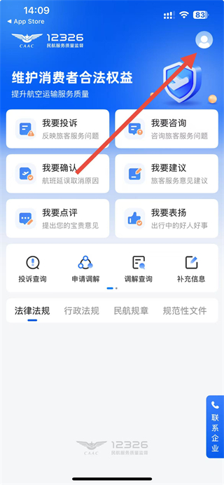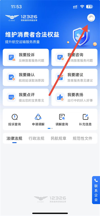 1、打开民航12326APP,点击右上角个人头像进入个人页面。