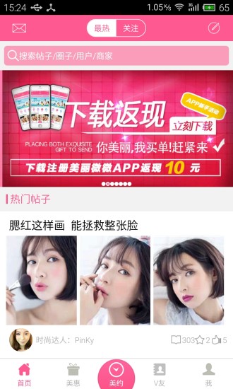随时随地预约美甲,美发,美妆等美丽顾问,轻松实现美丽蜕变;只要动一动手指,就能免费试用时下最IN的美丽产品,享受超低折扣的团购优惠活动。随时在美圈发帖,PO出自己的美丽心得,跟MM们畅享独特的美丽秘籍,成为万众瞩目的美丽达人。轻松购买物美质优的美丽正品。