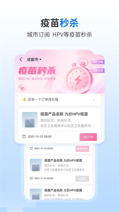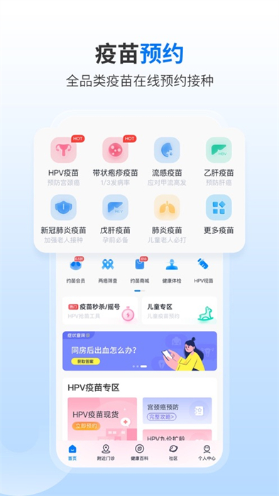 1、疫苗预约:包括HPV疫苗、新冠疫苗、流感疫苗、带状疱疹疫苗等成人及儿童全品类疫苗在线预约接种