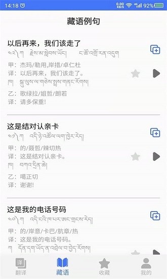 2.翻译收藏:藏语学习,生字词,难记词,专业词汇都可以收藏起来,复习随时翻看。