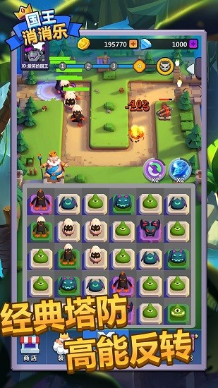 国王消消乐小游戏将塔防和消除手游结合在一起,让玩家一次能够感受到消除和塔防两种乐趣,还可以给你的国王换装,游戏里会有敌人向你发起进攻,你要通过消除来进行防御,成功击败敌人,快来试试吧!
