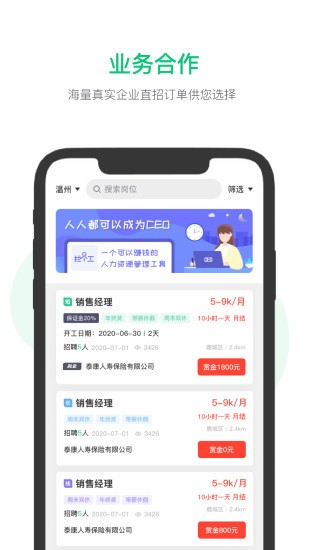 平台上有大量的企业订单,人力从业者(中介、劳务、职介所、企业HR)可以注册成为拉个工的微猎头,帮助企业快速完成招聘,同时获得企业悬赏的推荐奖励,让微猎头每月轻松有收入。