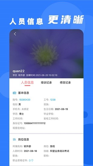 1、支持人员管理、培训记录查看、用户信息录入等功能。