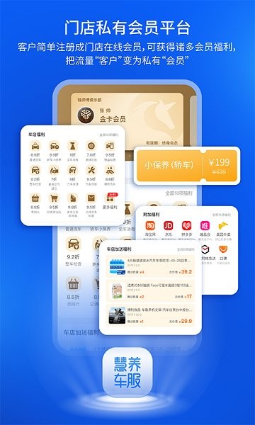 慧养车服,是汽车服务门店一站式增值创收服务平台,为汽服门店提供在线商城、智慧门店、智能报表、会员福利平台、体系培训等一体化解决方案,各种营销工具如套餐卡、优惠券、红包、积分卡、会员裂变等一应俱全。