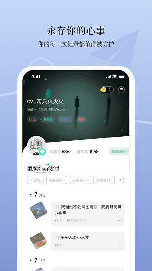 civicivi是一款基于Rlog(Radio Log,声音日志)异时空真人动漫化倾诉社交圈,在当前快节奏、忙碌的时代,建立自己的精神社交圈,敞开心扉,倾诉不为人知的心事,共享到“时空胶囊”。