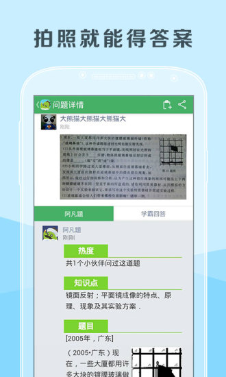 解题神器,手机上的智能解题机器人。通过拍照上传问题,即可获取答案,疑难问题随时解答。百位名师,在线解答,为你指点迷津!