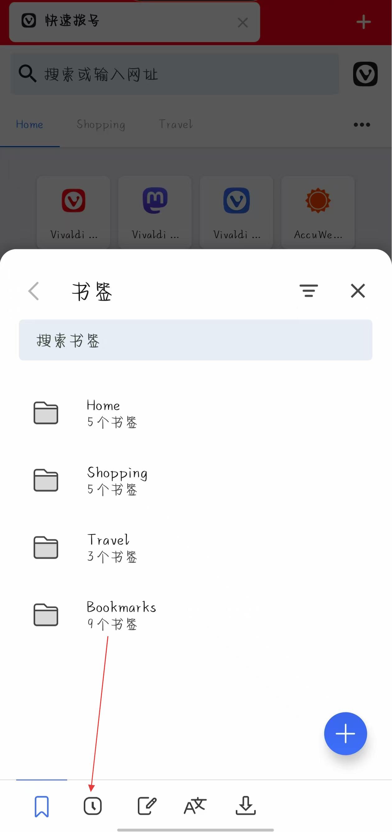 1、打开Vivaldi浏览器,点击左下角的图标,进入书签界面。