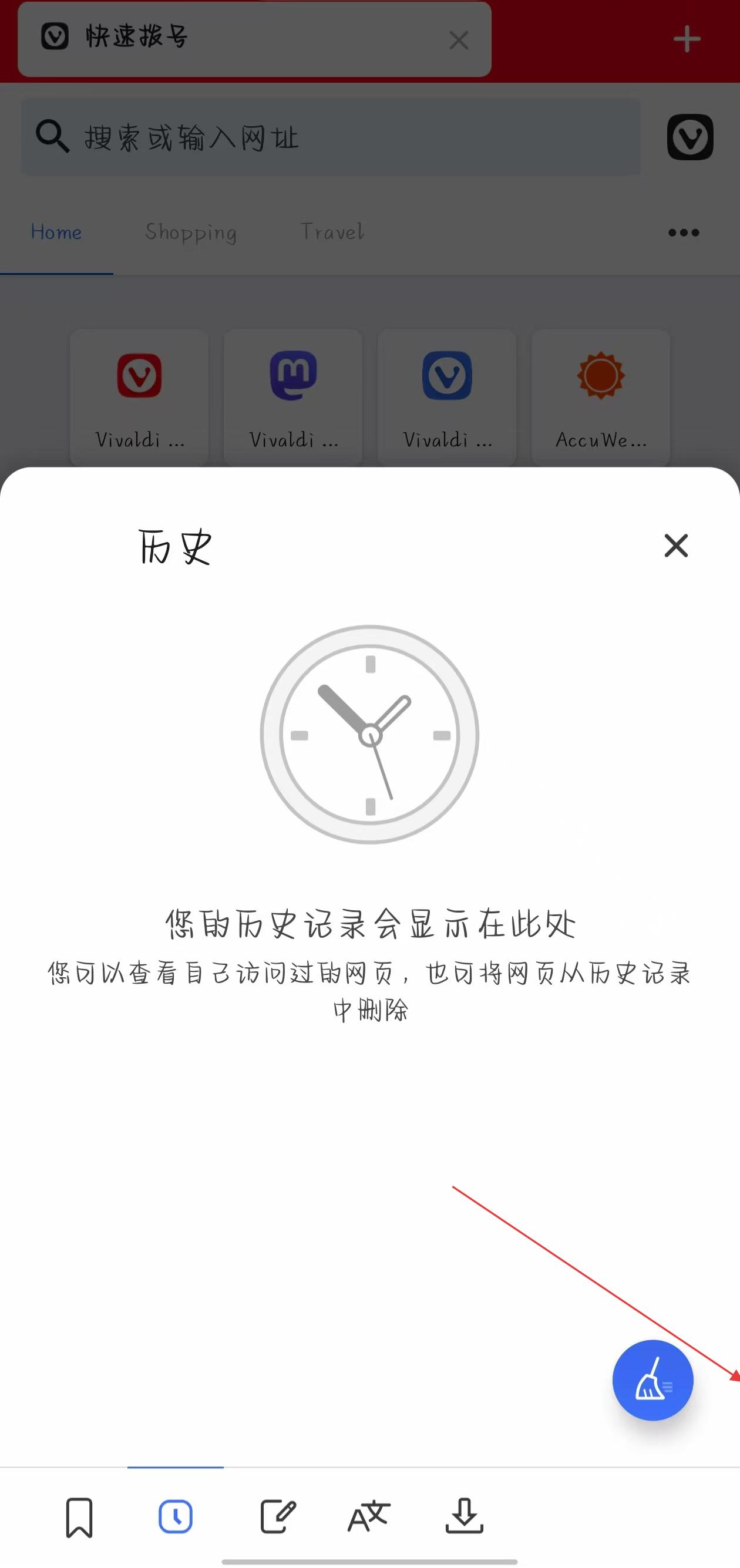3、在历史记录页面,点击右下角的蓝色清扫图标,进入删除浏览数据页面。