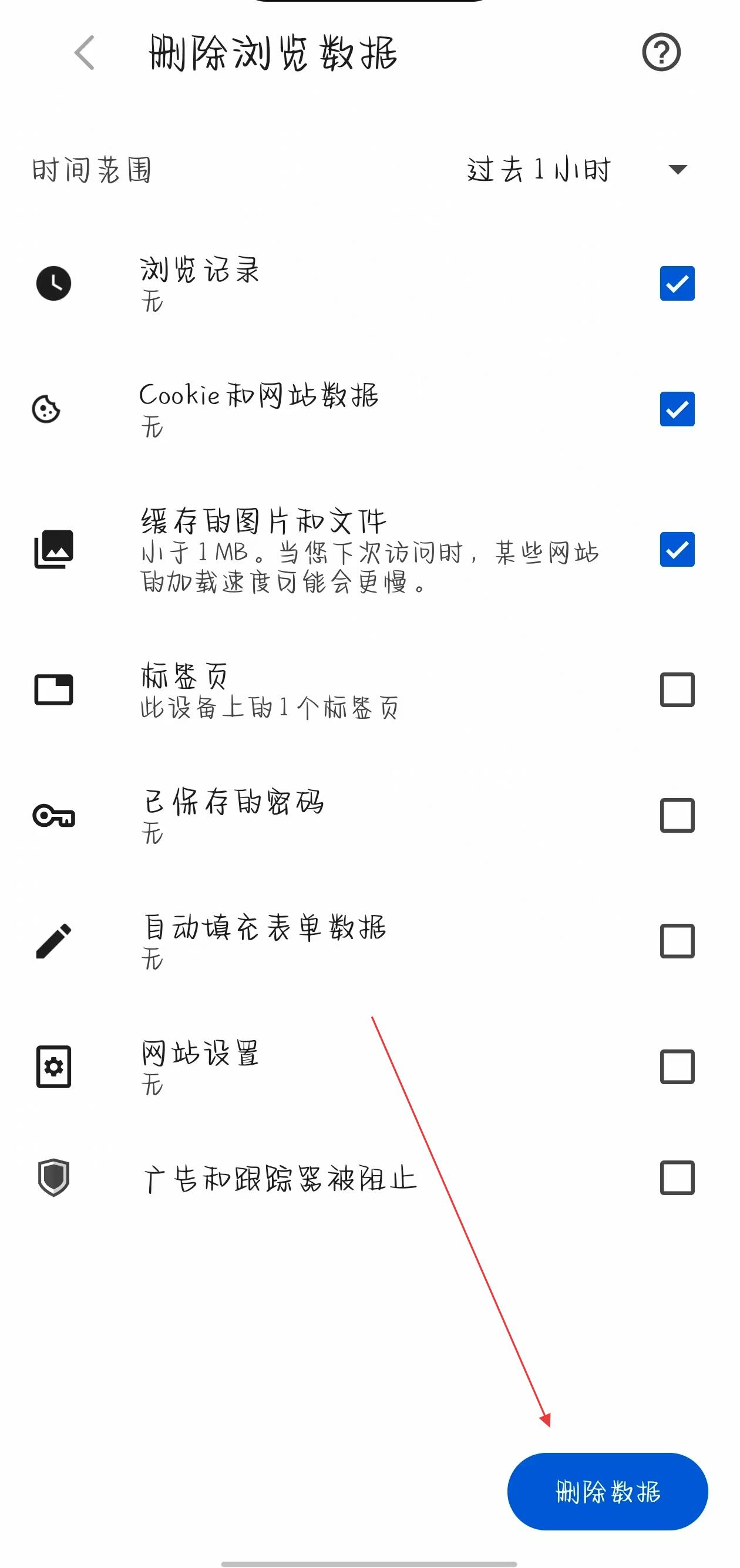 4、在删除浏览数据页面,选择要删除的时间范围,勾选需要删除的数据类型,然后点击删除数据按钮即可。